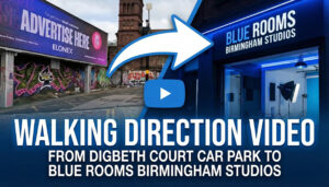 Exit Moor Street and head towards Bullring / Digbeth. Walk towards Digbeth High Street (you’ll see the area change into warehouses/creative venues). Continue towards Deritend / Custard Factory area. Turn onto Heath Mill Lane and continue until you reach: Rhubarb, 25 Heath Mill Lane (B9 4AE). The studio is inside Rhubarb — go to 1st Floor for The Blue Rooms.